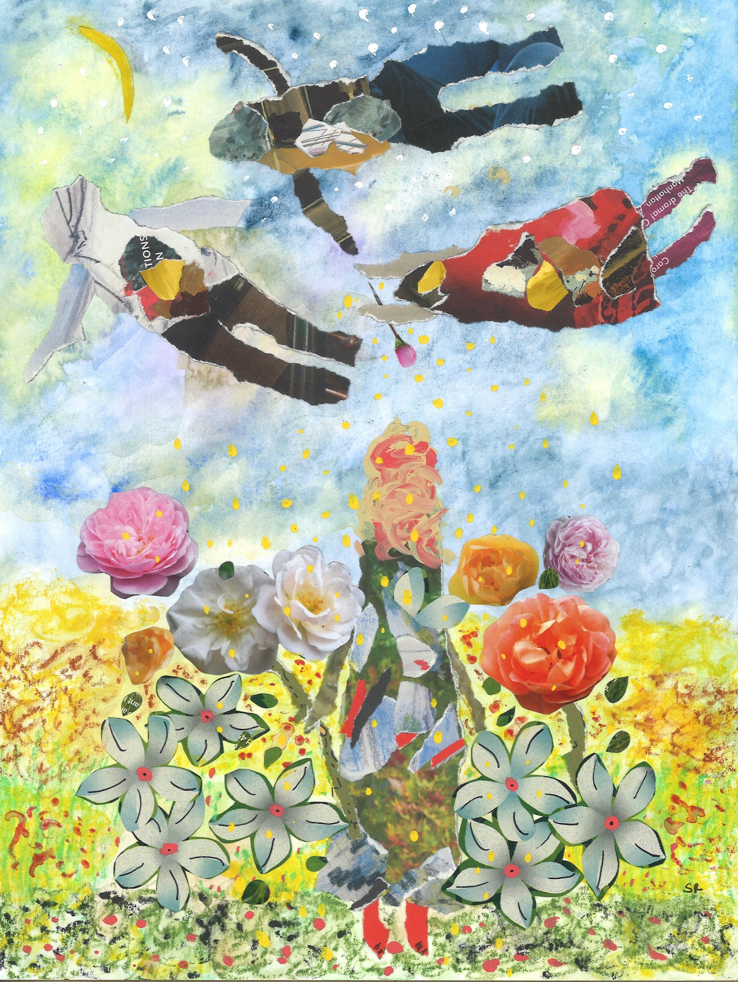 Out in the Moon Garden (watercolor paint, watercolor pencils, pen, acrylic paint, and recycled magazine paper)